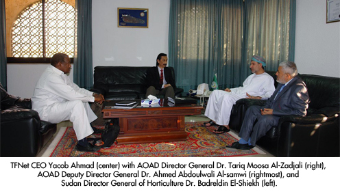 The workshop was discussed during a meeting between TFNet CEO Yacob Ahmad and AOAD Director General Dr. Tariq Moosa Al-Zadjali on 5 November 2013 at the AOAD headquarters in Khartoum. Other possible projects on improving tropical fruits cultivation in Arab League countries were also discussed.