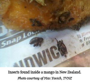 Blenheim resident Max Yovich this morning claimed his wife found small black bugs inside a mango she bought on the weekend. He has photo evidence of the find.