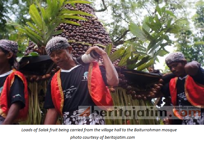 The festive feeling was felt as  six people begin to bear the load of fruit of as high as 4 meters. It took about 30 thousand pieces of the Salak fruit to make the load. The black fruit was donated by local residents. They paraded the loads from the village hall to the Baiturrohmani mosque .