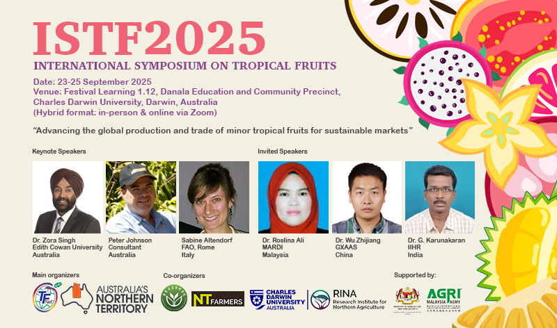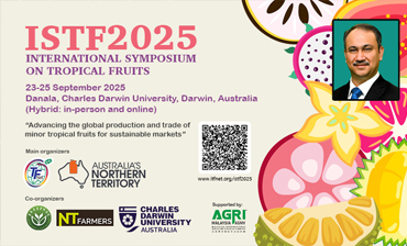 2025 International Symposium on Tropical Fruits (ISTF 2025) Date: 23-25 September 2025 Venue: Charles Darwin University, Darwin, Australia (Hybrid: in-person and online)9th TFNet General Assembly and 17th TFNet Board of Trustees Meeting Date: 22 September 2025 Venue: Northern Australia Development Office, Darwin, Australia (Hybrid: in-person and online) |