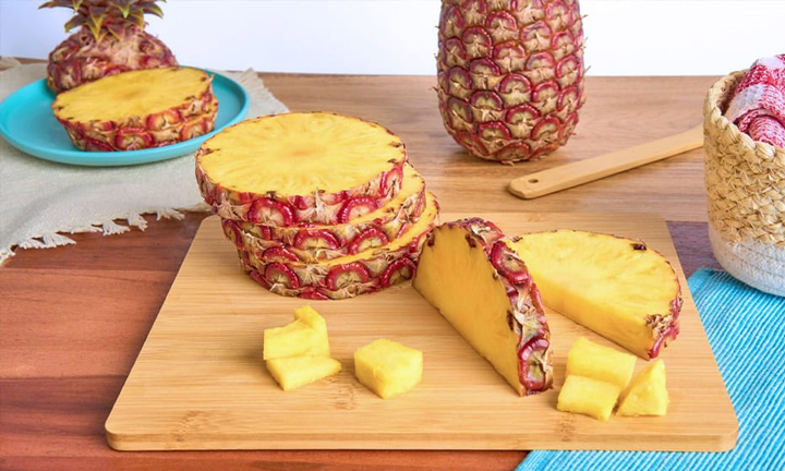 The fruit stands out for its red shell and bright yellow inside. It comes from blending a standard pineapple with a Morada type, which has a purple hue. Each one needs two years to mature on the plant in Costa Rica. Producers harvest it crownless and pack it in sleek boxes, making it ready for display or gifting.